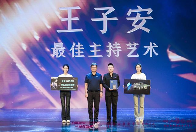 上海戏剧学院电影学院党总支书记韩永胜为王子安颁发“最佳主持艺术奖”。