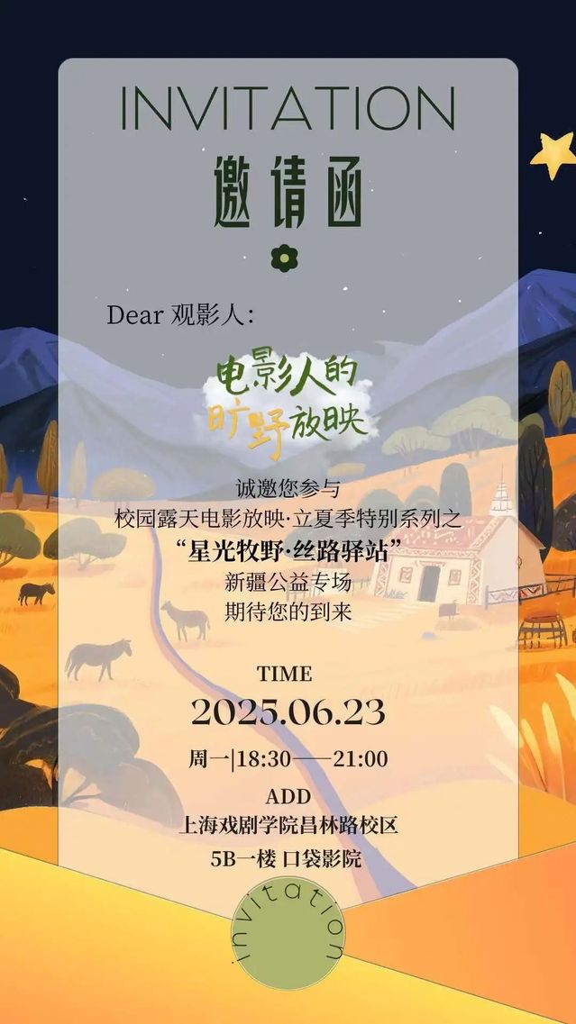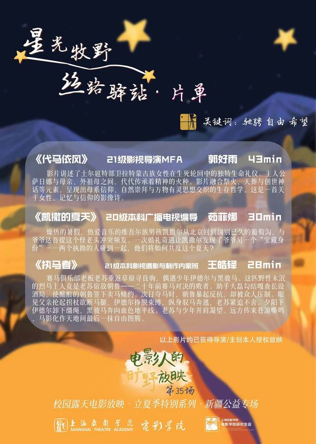 2025年6月9日,在立夏的星空下,上海戏剧学院研究生会电影人的旷野放映队跨越千里,将银幕立于新疆图木舒克市的校园之中。负责人李晓天带领团队为兵团三师二中的同学们带来三部分别聚焦蒙古族、维吾尔族、草原马背文化的青年导演短片。此次活动以高校创作力量联动西部教育阵地,为边疆学子播下艺术启蒙的种子,让光影成为东西部青春对话的第一声号角。