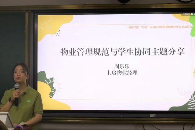 上房物业经理周乐乐从专业视角出发,讲解了安全管理,隐患问题,应急管理等物业工作的规范流程。她特别强调学生与物业的协同配合至关重要,如及时反馈设施隐患、规范投放垃圾等行为,能有效提升寝室居住体验,保障住宿安全。