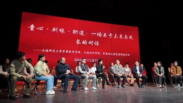 《匠心》由上戏电影学院副院长董健执导,师生共同演绎,聚焦一群致力于职业教育的青年教师,回顾跨越半个多世纪的职业教育探索之路。随着剧情铺展,观众席不时响起阵阵掌声与会心笑声。演出结束后,上海师范大学和紫薇实验幼儿园的师生党员代表,与话剧《匠心》主创团队面对面,开展 “童心·剧缘·职道——一场关于未来与成长的对话”党建联建活动,结合观演感受,畅谈台前幕后、教育发展变化。上海师范大学学前教育学院教师表示,“话剧艺术化的表达,让教育家精神从抽象理论变得可感可知、可学可悟,剧中教师们扎根职教一线、坚守育人初心的情节,正是教育家精神的生动写照。”