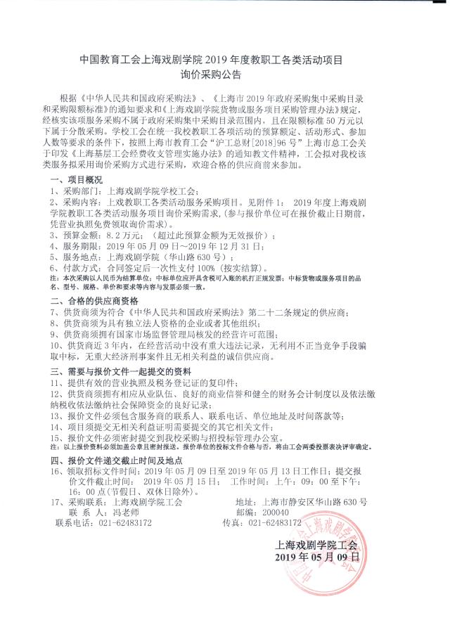 中国教育工会上海戏剧学院委员会2019年度教职工各类活动项目询价采购公告