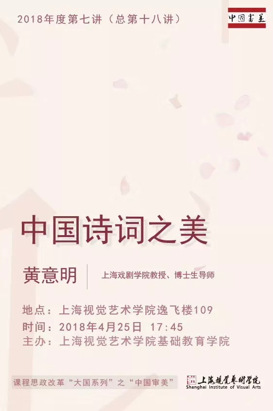 2018年4月25日下午17:45,文学学者、上海戏剧学院教授、博士生导师黄意明教授赴上海视觉艺术学院作了主题为《中国诗词之美》的演讲。本次活动系上海视觉艺术学院基础教育学院主办的“课程思政改革’大国系列’之’中国审美’”2018年度的第七讲(总第18讲)。活动由上海视觉艺术学院”中国审美”课程负责人潘端伟博士主持。
