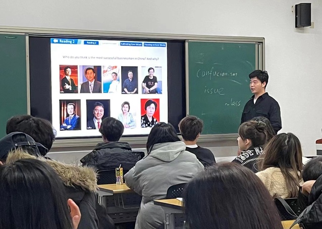 冯老师通过课文From the ‘American dream’ to a Chinese Dream (从美国梦到中国梦),讲述了新东方创始人俞敏洪在创业过程中的起起伏伏,经历过的各种甜酸苦辣,以及他的心路历程,对我们大学生的成长有一定的启示作用。