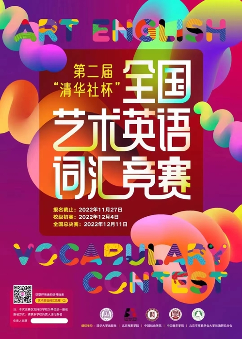 为落实立德树人根本任务,提高全国学生的英语词汇水平和英语学习积极性,增强学生艺术英语词汇学习和运用能力,清华大学出版社、北京市高教学会大学英语研究分会、北京电影学院、中国戏曲学院、中国音乐学院于2022年12月4日、12月11日举办第二届“清华社杯”全国艺术英语词汇竞赛校级初赛与全国总决赛。
