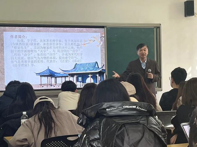 黄教授通过讲述张载的代表作《西铭》,阐释了古代儒、释、道三家思想的互动,并将《西铭》所阐述的儒家理想与西方基督教思想和马克思的相关学说做了比较。这种融通古今中外的论述方式,使其课堂具有了哲学的思辨性和文学的审美性,也充满了思想火花的碰撞。这样的教学既重视古代优秀文化的传承,又注意到了传统文化的现代转化,可以启发同学们进行深入思考。
