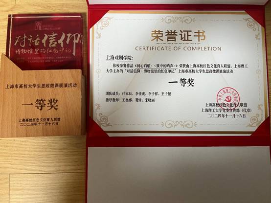 2024年11月16日,来自上海师范大学、上海理工大学、上海音乐学院、华东师范大学、华东理工大学、东华大学、上海财经大学、上海体育大学、上海交通大学、上海戏剧学院、同济大学(排名按比赛出场顺序)等沪上11所优秀高等学府的大学生们齐聚上海理工大学军工路校区大礼堂,参加“对话信仰——博物馆里的红色记忆”上海市大学生思政微课展演活动。这场盛会不仅是一次思想的碰撞,更是一次心灵的洗礼,让在场的每一个人深刻感受到了信仰的力量。上戏团队由马克思主义学院王奥娜老师、电影学院费泳老师、龙华烈士陵园朱晓丽副馆长担任指导教师,由电影学院2021级播音与主持专业任家辰、李佳宬、李子祥、王子健四位同学组成学生微课展演团队,李泽浩同学担任声音指导,马克思主义学院给予大力支持,经过多次排练、彩排等前期准备,终于成功夺冠!上海戏剧学院初心理论社5位同学组成现场亲友团见证本次比赛的全过程。