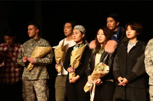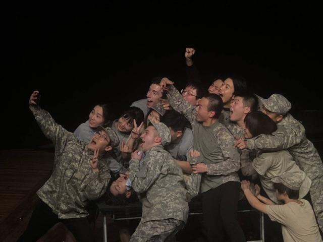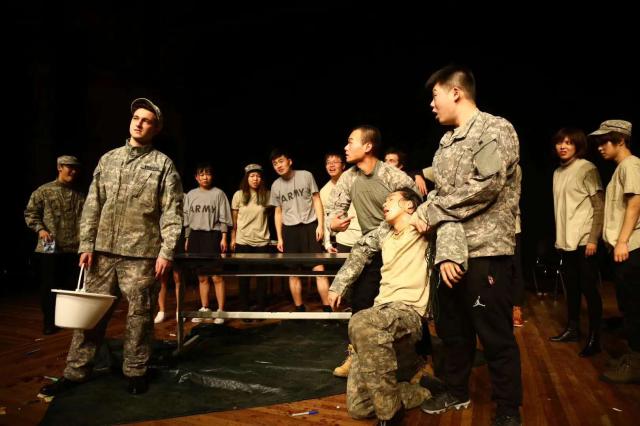 参与两部作品演出的演员以编剧专业学生为主,但值得一提的是,我院留学生也参与了演出并且担任了主要角色。跨文化交流学2017级留学生葛金鹰(意大利)领衔主演《走进军中》(Into The Zone),他的表演获得观众的好评。而表演系研究生叶沛霖(美国)和汉语留学生何鸿浩(澳大利亚)也参演其中。面对近130位到场的嘉宾、教授和观众,他们出色的表演很好地表现了剧本的原貌。这很大一部分原因是两国学生文化交汇的成果:哥大学生在排练过程中向上戏学生阐述剧作用意和空间安排,上戏学生则尝试寻求剧本中一些美国元素的本土化表达,最终在双方的共同努力之下呈现出了一场易于中国观众接受的演出形式。《许是明日》风格偏压抑,《走进军区》风格偏凌厉,但都较好地向观众传达了剧作的精神内涵。
