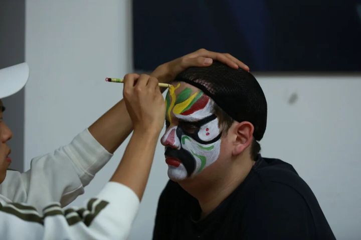 “笔下乾坤画脸谱”将现场气氛推向首个高潮。戏曲学院23京剧表演专业李奇泽、石天乐同学俯身为留学生勾画精美脸谱,以一笔一画的细腻指导,完成了一场跨越语言的艺术传授。戏文系同学自发担任起“文化翻译”,为国际伙伴讲解脸谱背后的性格与故事;上海音乐学院留学生与身边同侪展开交流。笔起笔落之间,一张张独具个性的关羽、程咬金、孙悟空等人物脸谱在协作中诞生,现场俨然成为一个生动活泼的脸谱艺术工坊。