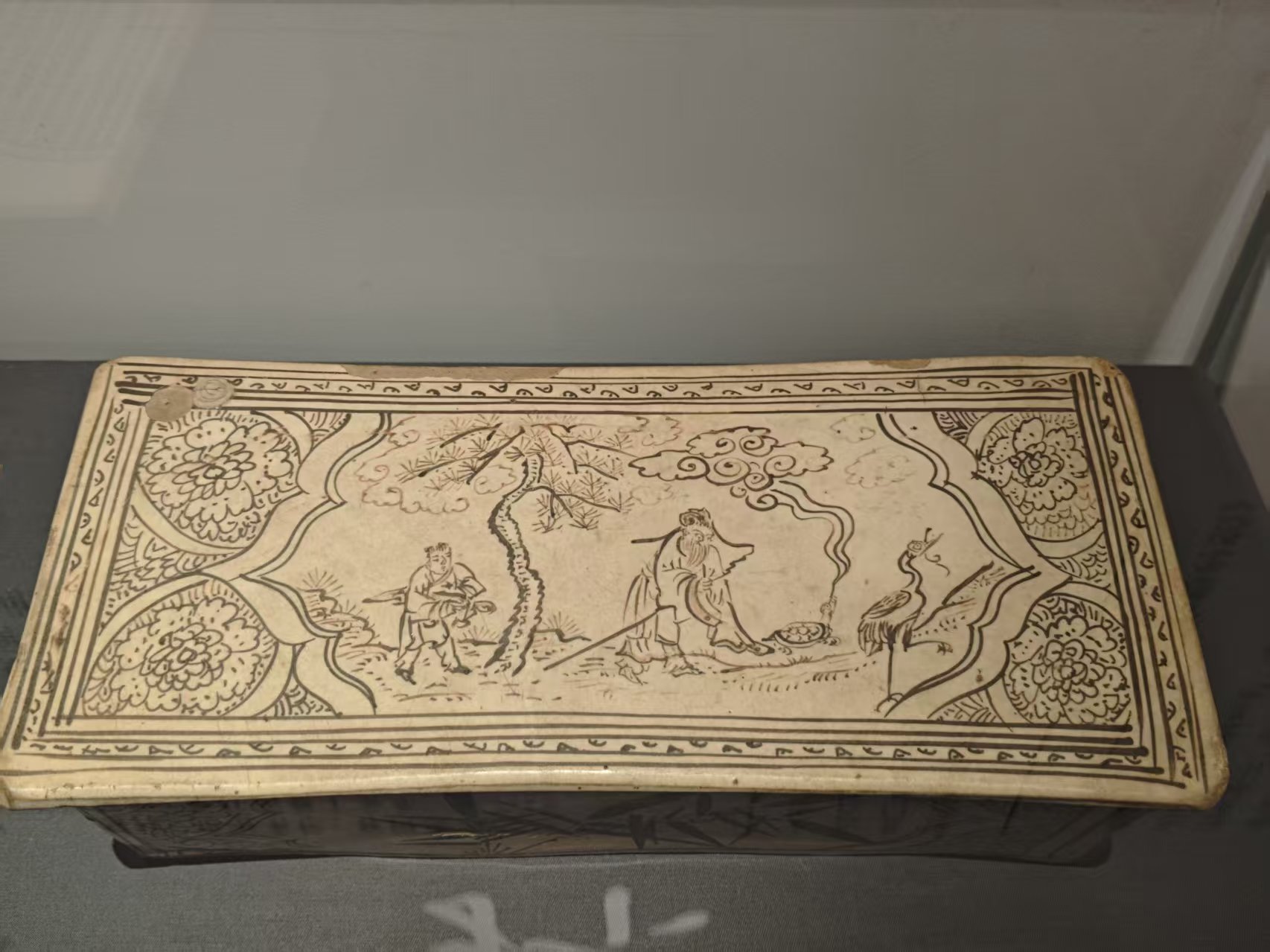位于磁县的磁州窑博物馆,藏有一金代赵抃入蜀图长方枕,菱花形开光内绘制出一策杖前行的老者,他的身后跟随着一位怀抱古琴的童仆,老者前方有一龟、一鹤,俱引颈向上,龟吐云气,鹤在长鸣。