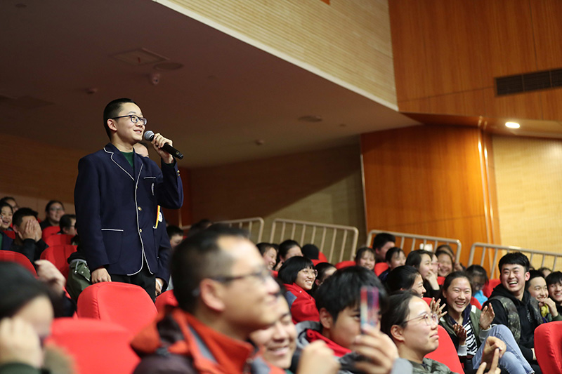 有趣的是现场几个“小瞌睡”竟被严格的学长逮了个正着,被罚起立回答问题,一时会场气氛紧张。没想到演讲结束,高情商的学长“化干戈为玉帛”,将被罚的学生与积极互动的小同学们一起邀请上台感谢,并亲手赠上自己签名的笔记本作为纪念,还不忘叮嘱他们今后多记笔记多思考,言谈举止闪烁着智慧的光芒,令台上小同学心悦诚服,台下师生也情不自禁掌声四起,这最为温情的一幕令在座所有人难忘……