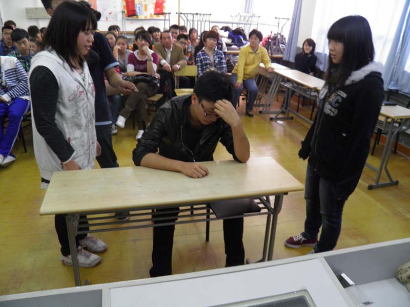 在主题班会的最后,11美术班同学以小品的形式,表演了一个行为表现尚佳的学生是如何一步一步滑入了毒贩子的魔爪中。警示同学们,防微杜渐,提高自我保护意识,从小事上就要规范自己的言行,避免落入邪恶的圈套。主题班会在观众热烈的掌声中完美结束。