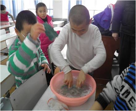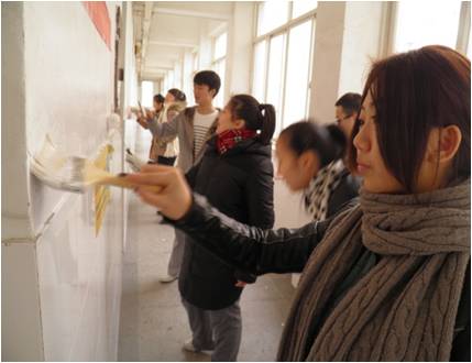 在教学楼,学生科副科长周徐红老师身先士卒,穿起工作服带领同学们一起劳动,各班班主任也积极参与,在教室中坐镇,指导学生开展活动。在领到自己的任务后,学生们将走廊上,厕所门口、教室里有划痕和污渍的墙面重新进行粉刷,用百洁布将桌面上的圆珠笔印统统刷洗干净。有的学生脱下长外套、卷起袖口蹲在地上铲除黏住的口香糖,有的学生站上桌子,清理高处的蜘蛛网。在这寒冷的冬日,同学们却干得热火朝天,额头上都渗出了汗水。在团员的带动之下,许多非团员的学生都纷纷加入进校园文明行的活动中来,将大家共同课的教室和楼道打扫一新。