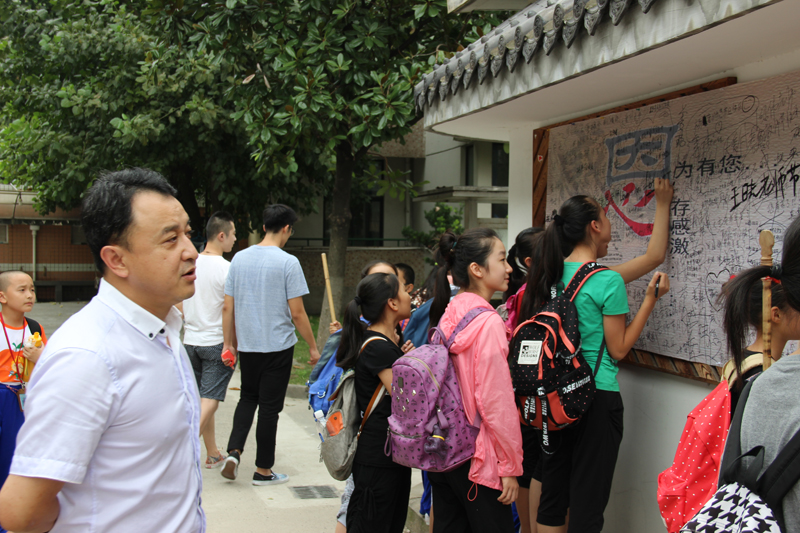 接着,便是由学生科老师组织的教师节签字活动——在一张5、6米长的横幅上签字,写下想老师们说的话。这活动年年都有,而今年大家也都相当的有“激情”,架势绝不输于往年。一小时内,从那一支支写掉的笔头中,大家的热情也就可见一般了。在一旁发笔的团委同学,只见一大波一大波的同学们在不断靠近中。从“**老师节日快乐”,到“**老师,您辛苦啦”,甚至是“**老师,我们爱你”,到最后的“**老师,男神......女神......”。字里行间透露着我们年轻的朝气,更体现出的是我们对老师的喜欢和崇拜。