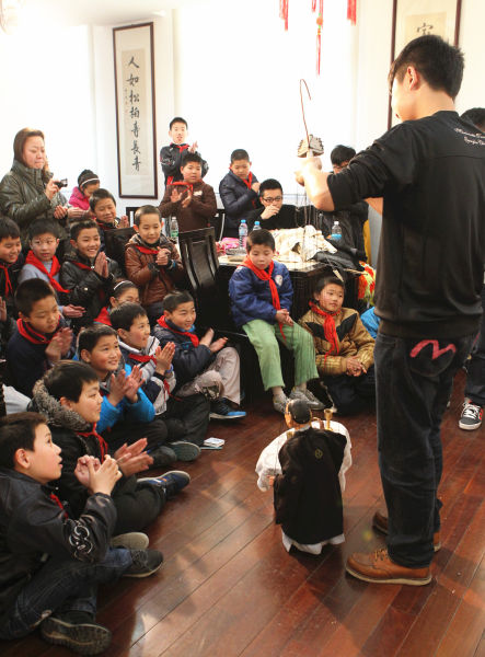 最后的互动环节,参与活动的小朋友们与木偶班的哥哥姐姐们进行了近距离的互动,不少小朋友们亲手操纵了木偶,体验并直观感受了一回木偶艺术的独特魅力。