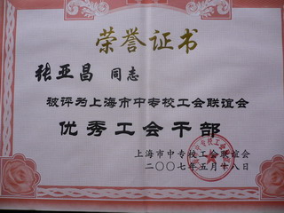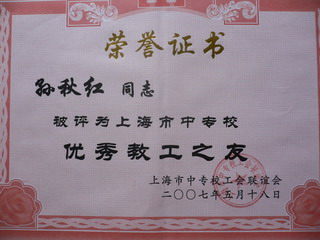 在庆典活动的表彰会上,我校党总支副书记孙秋红被授予“上海市中专校优秀教工之友”称号,我校工会主席张亚昌老师被授予“上海市中专校优秀工会干部”称号。