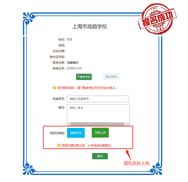 4、建议视频格式MP4、MOV,视频录制大小在2G以内。视频文件请压缩打包后上传至招生报名平台(建议使用电脑PC端登录,在准考证下载区的视频压缩包上传链接)及发送招生办邮箱备份。所有文件名请标注考生准考证号及姓名。