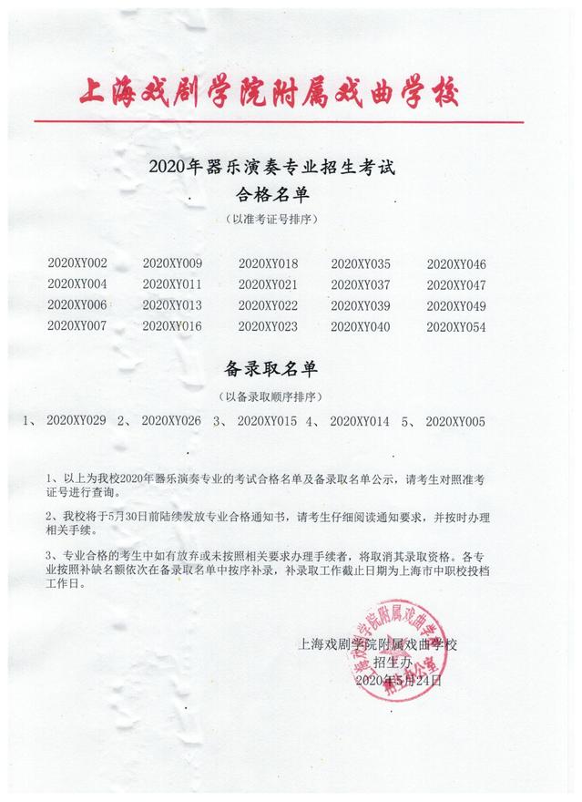 2020年开云足球首页官网下载附属戏曲学校器乐演奏专业招生考试合格名单公示