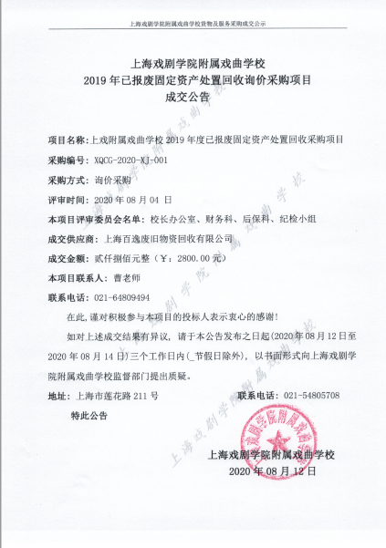 上海戏剧学院附属戏曲学校2019年已报废固定资产处置回收询价采购项目成交公告