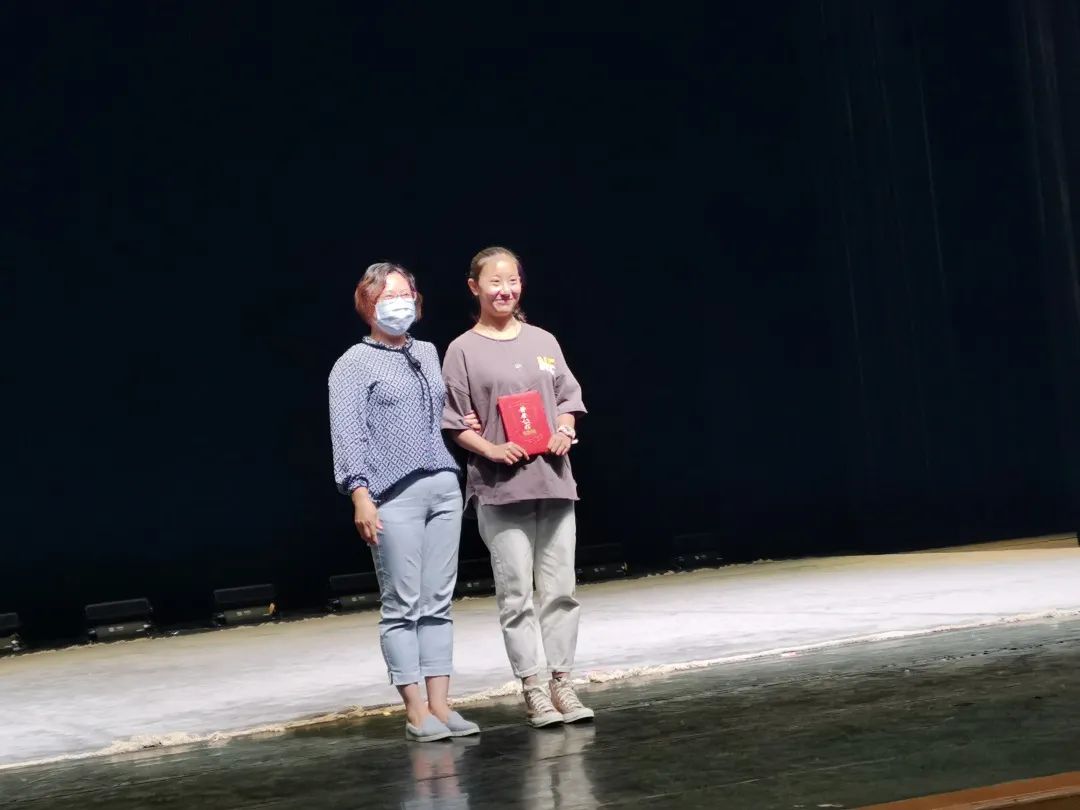 接下来是激动人心的颁奖环节,许多同学在各项比赛中取得了优异的成绩。首先宣布的是:首届海市金童奖的获得者—17京剧班张祥群,由唐禾香副校长为她颁奖。接下来由刘爱香副书记为上海市梅陇镇新馨少年获得者—17京剧班张祥群颁奖。