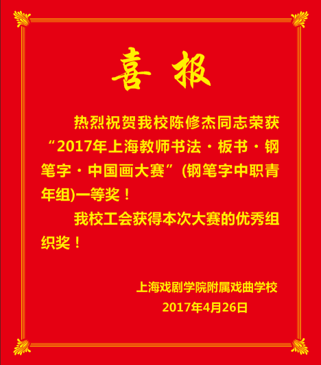 热烈祝贺我校陈修杰同志荣获“2017年上海教师书法 板书 钢笔字 中国画大赛”一等奖