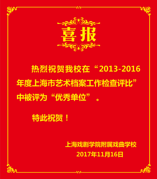 热烈祝贺我校在“2013-2016年度上海市艺术档案工作检查评比”中被评为“优秀单位”