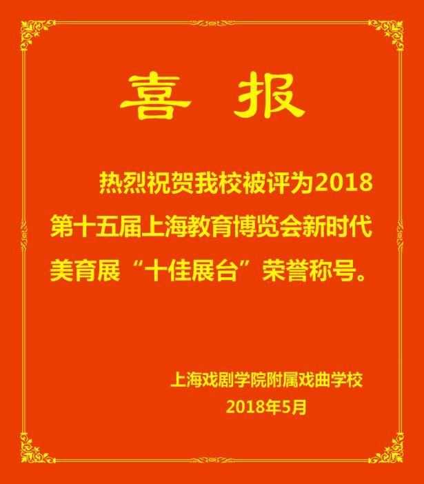 热烈祝贺我校被评为2018第十五届上海教育博览会新时代美育展“十佳展台”荣誉称号