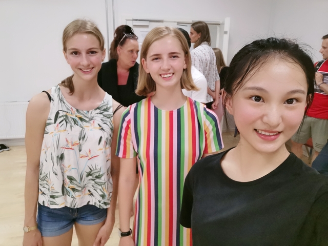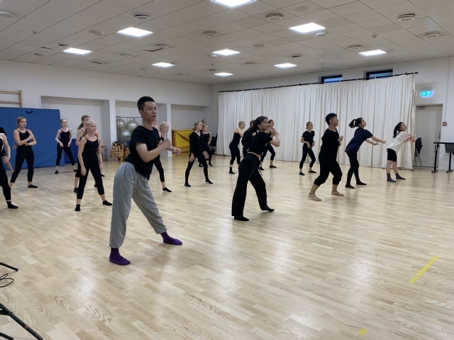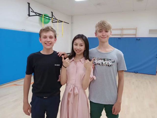 我们的第一节课是拉丁课,拉丁老师在两年前来过中国,我们很高兴可以再次跟他学习,他从步伐到手势耐心的教我们,最后丹麦的学生与我们两两一组进行双人舞的学习。我有幸被分到一个跳得特别好的男孩,他带着我跳,我感觉自己第一次那么享受跳拉丁舞。芭蕾课,Melody老师特别有意思,他怕我们拘谨还常常通过搞笑的声音、动作来烘托气氛,我们都被逗得哈哈大笑。芭蕾课老师从最基本的动作开始教,更加注重发力的位置和控制力,这也正是我们欠缺的部分。英语课和音乐课,算是我们和丹麦学生的破冰活动,老师们通过猜字谜、拍节奏、语言交流等游戏进行互动,大家都很喜欢这样的氛围,渐渐的,我们彼此熟络了起来。我们观看了当地学生的芭蕾课,与中国不同的是他们不同的年级会一起上这节课。在我看来,虽然他们的动作或许不是那么标准,但大多数人都会尽力去做。有几个女孩特别认真,无论别人如何,她们都很专注地将动作做到极致,这种专注度在我们的年纪是十分难得的。在最后一天的学习中我们与他们一起上了芭蕾课,每个人都将自己最好的一面展现出来,所有人都很享受这个课堂氛围。现代舞课Lene老师教了我们几个组合,编排得很好看。丹麦的学生跳现代舞有一种与生俱来的感觉,力度刚刚好。包括教5、6年级的小朋友,一开始他们学音乐剧舞蹈还不是很快,但是现代舞他们学得特别快,很有天赋。Melody老师在最后一天教了我们特别难的组合,非常多的技巧,我觉得自己做不到,但是Melody老师一直鼓励我 “just try it”。我发现自己可以翻右手的侧手翻了,我十分兴奋。因为我逾越了心里胆怯的那道坎儿,有的时候大胆去做真的会成功。