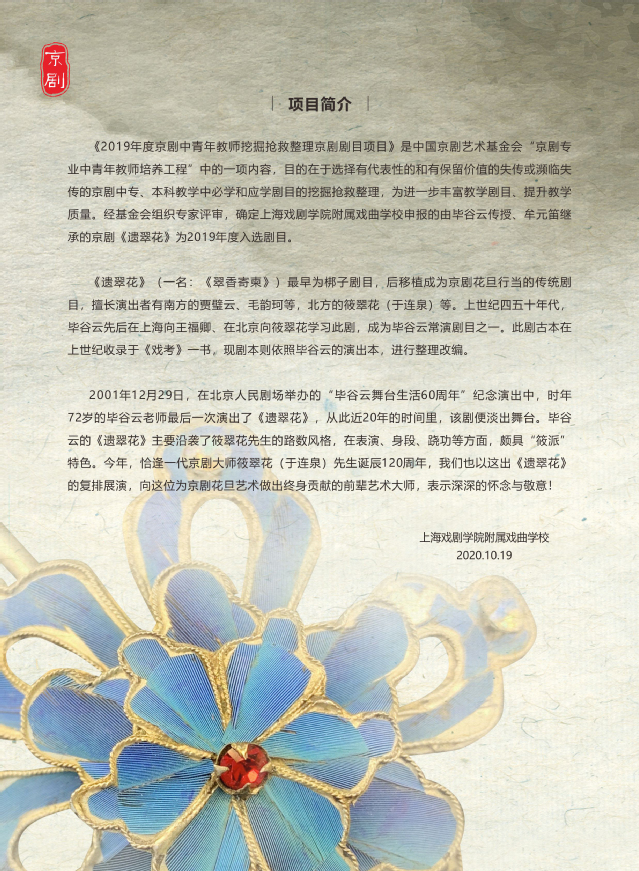 2020年10月19日晚18:00时,中国京剧艺术基金会2019年度京剧中青年教师挖掘抢救整理京剧教学剧目项目京剧《遗翠花》,在我校白宫剧场举行汇报展演验收工作。