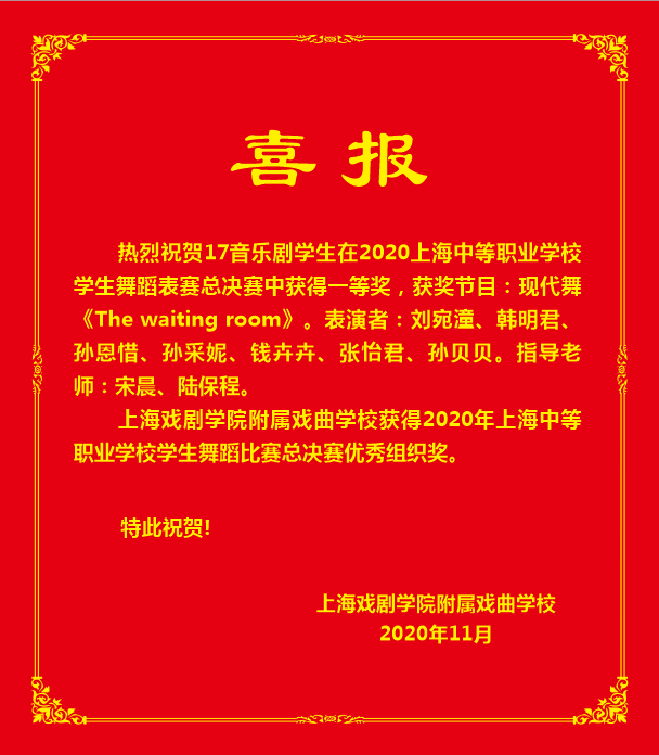 热烈祝贺我校17音乐剧学生在上海中等职业学校学生舞蹈表演总决赛中获得一等奖,我校获得优秀组织奖