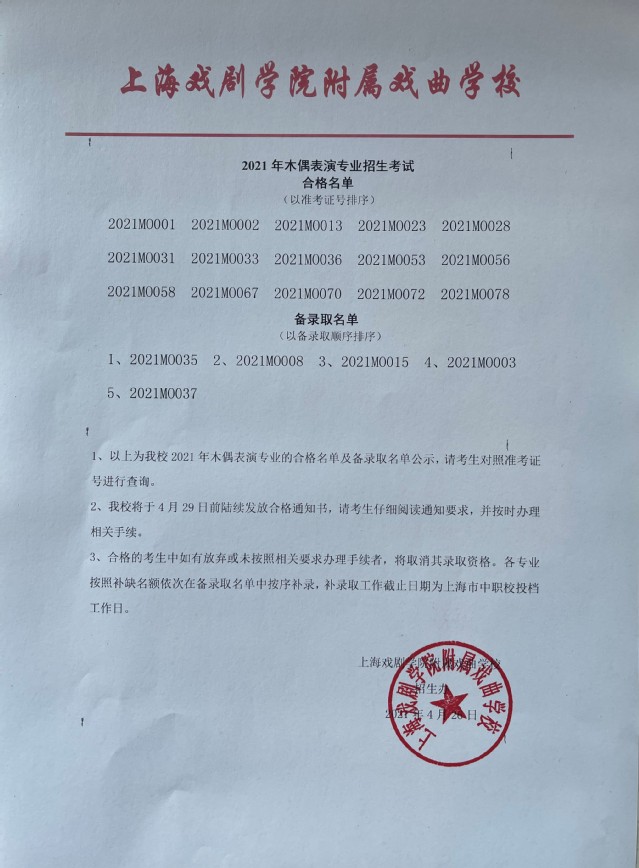 上海戏剧学院附属戏曲学校2021年木偶表演专业招生考试合格名单