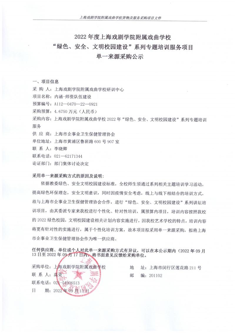 2022年度戏校绿色安全文明培训单一来源采购项目