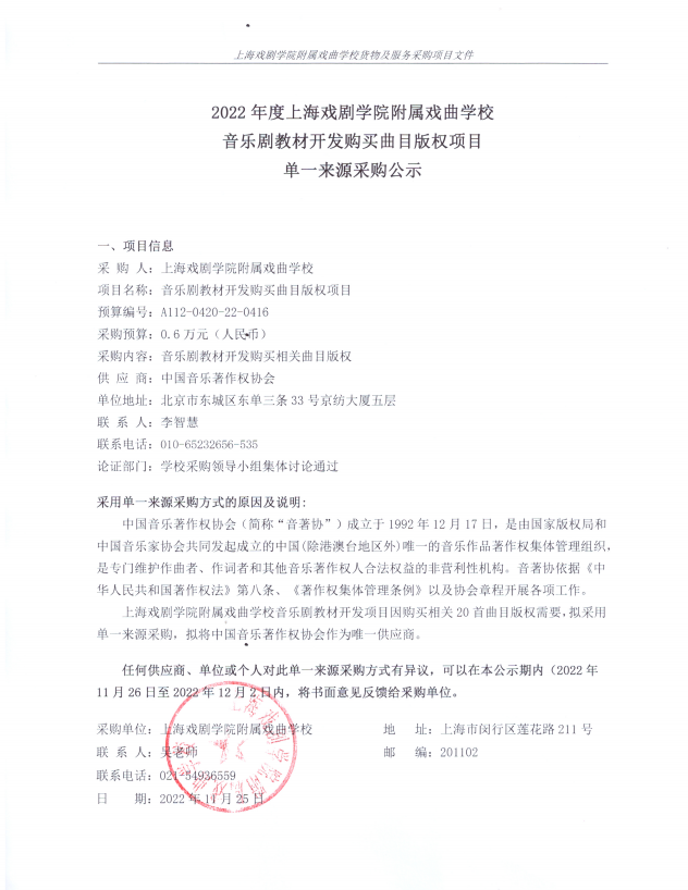2022年度开云足球首页官网下载附属戏曲学校音乐剧教材开发购买曲目版权项目单一来源采购公示.pdf