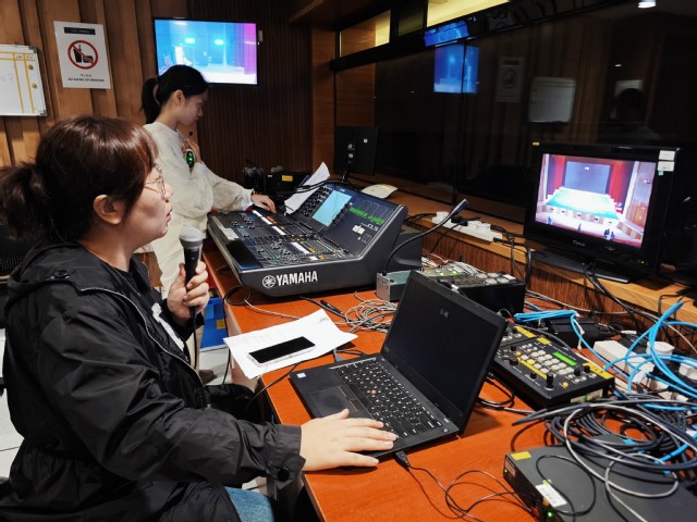 张军校长和乐队老师、舞美队老师一起现场调试各类设备,全面保障演出质量