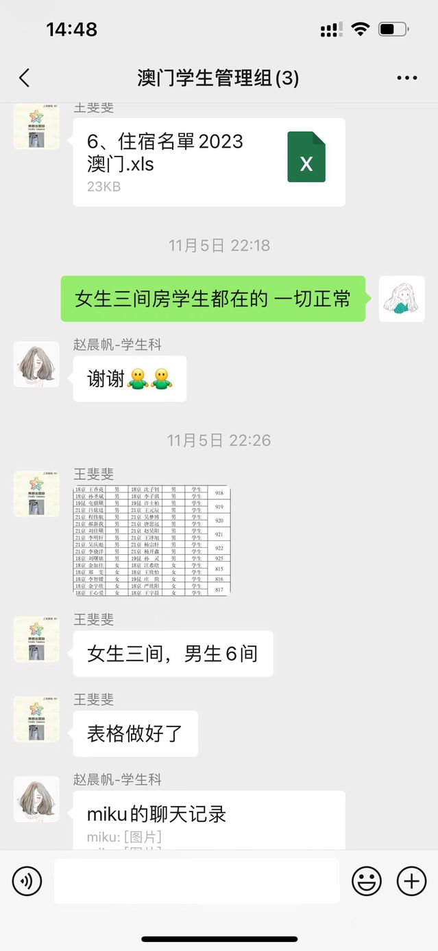 由于这次住宿地的管理要求,男女楼层严格区分,不可以跨楼层走动,负责学生管理条线的老师积极应对,每天通过微信群等方式查寝,确保学生安全