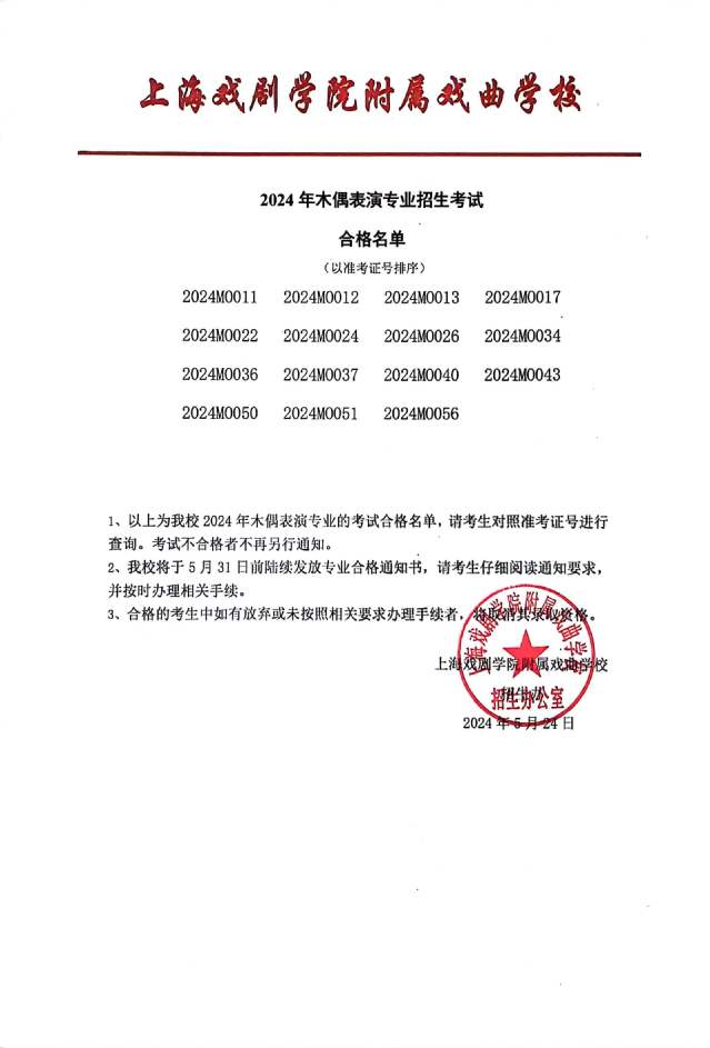 2024年上海戏剧学院附属戏曲学校木偶表演专业招生考试合格名单
