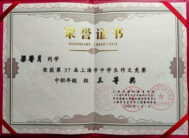 2025年3月8日以“文字记录青春,阅读点亮未来”为主题的第37届上海市中学生作文竞赛颁奖大会圆满举行。我校23级美术专业梁馨月同学在激烈竞争中脱颖而出,荣获中职组三等奖。
