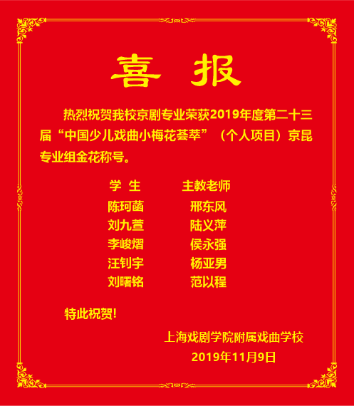 热烈祝贺我校京剧专业荣获2019年度第二十三届“中国少儿戏曲小梅花荟萃”(个人项目)京昆专业组金花称号