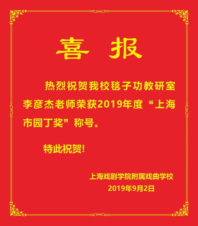 热烈祝贺我校毯子功教研室李彦杰老师荣获2019年度“上海市园丁奖”称号