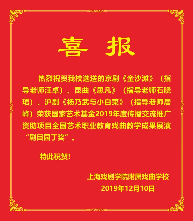 热烈祝贺我校选送剧目获得国家艺术基金2019年度“剧目园丁奖”