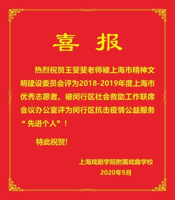 喜报!我校王斐斐老师获得2018-2019年度上海市优秀志愿者等称号