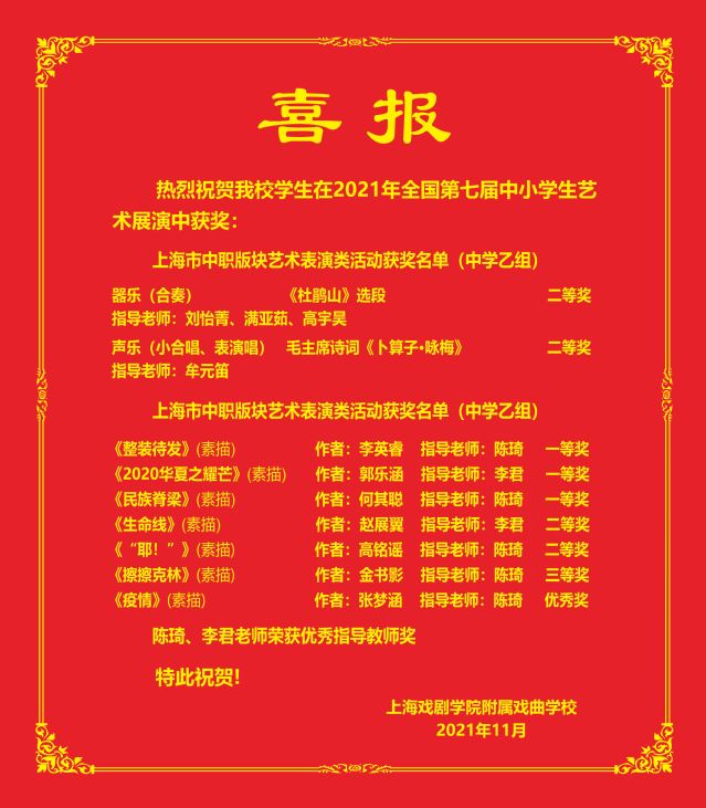 热烈祝贺我校学生在2021年全国第七届中小学生艺术展演中获奖