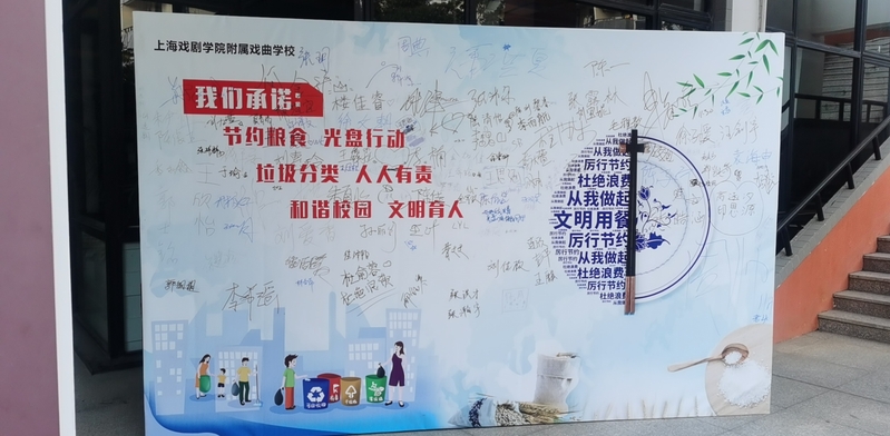 学生、教职工纷纷在承诺板上签名承诺:节约粮食,光盘行动,垃圾分类,人人有责,和谐校园,文明育人