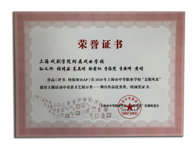 祝贺!我校学生孙义仰等作品《评书、快板和RAP》2020年上海市中等职业学校“文明风采”德育主题活动优秀作品奖(指导教师:孟真宇、张森增)