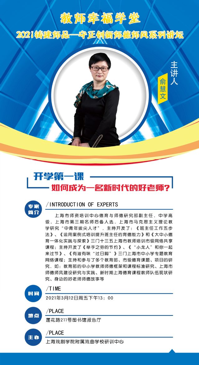 为持续推进我校教师师德师风建设工作,不断提高我校教师的师德素养,我校研训中心于2021年3月12日下午13:00,特邀上海市师资培训中心德育与师德研究部副主任俞慧文老师为全校教师带来2021铸建师品—守正创新师德师风系列讲坛开学第一课——《如何成为一名新时代的好老师?》