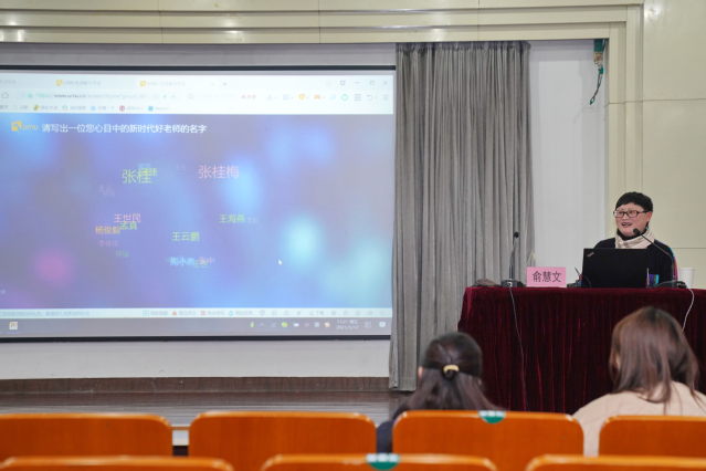 首先,俞主任和老师们进行了一次手机互动,让大家写出心目中的好老师,活跃了现场的气氛,之后在“胸中有纲”这个模块分析了新时代四有好老师的标准,以于漪老师为例进行了生动的讲解。在讲解“手中有法”时以“迟到处理”案例为引,介绍了各国的处理方法,并请老师们进行手机问卷,选出自己认为最佳的方法。经汇总,以色列教师的处理方法最受欢迎。在“目中有人”“心中有情”模块中以于漪老师为例,让老师们明确肩负的使命和责任。最后,俞主任讲出了教师的三重境界“形成教育自觉”、“确立教育信念”、“要有教育信仰”。