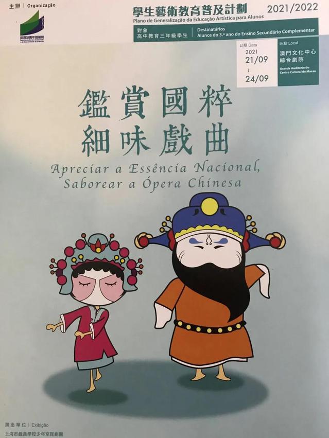 2021年9月19日-25日,应澳门教育及青年发展局(以下简称教青局)邀请,上海戏剧学院附属戏曲学校一行66人在刘爱香团长的带领下,再次亮相濠江,于澳门文化中心综合剧院为当地高三学生带来了 “鉴赏国粹、细味戏曲”的六场专场演出。虽然此次澳门之行因为疫情被延迟半年之久,但好事多磨,佳期难得,可谓“锣鼓铮铮闹中秋,梨园少年韵常流”,戏校师生以戏会友,为澳门学生送来了精心准备的中秋“大礼包”!