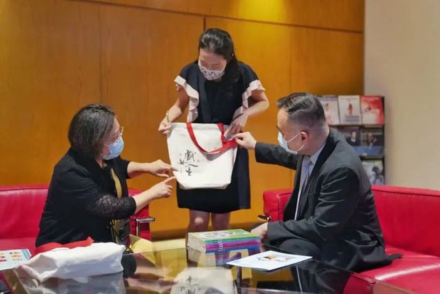 澳门演出期间,教青年局学生厅陈旭伟厅长特地来看演出,并安排时间与我校带队老师见面。刘爱香团长向教青局赠送了由我校江沛毅老师主编的《昆曲有故事》读本两套。该书封面以活泼而写意的手法勾勒出故事的人物角色,里面文字又以深入浅出的手法展现了昆曲的艺术魅力,是非常适合澳门学生阅读但却急缺的普及型读本,陈厅长喜出望外欣然接受。最后,双方就学生戏曲普及计划的下一步合作,以及对青少年传统文化素养培养等方面进行了交流。陈厅长特别期待我们明年继续到澳门为学生普及演出,全体师生闻讯后大受鼓舞,因为这是对我们此次澳门之行最好的赞美!