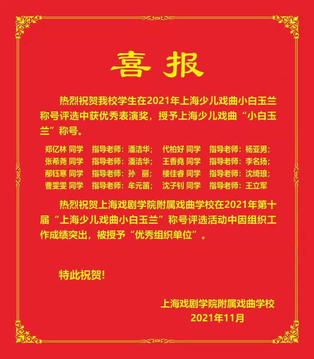 热烈祝贺我校被授予2021年上海少儿戏曲小白玉兰评选优秀组织单位