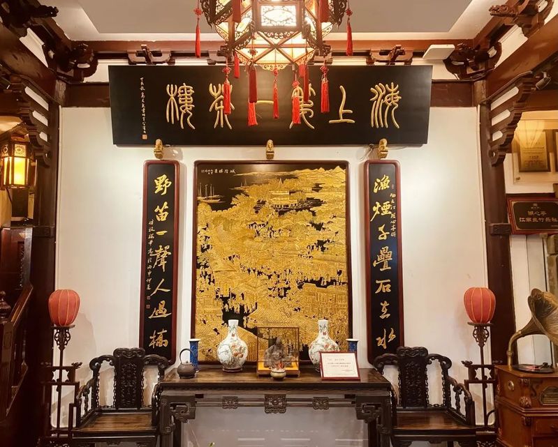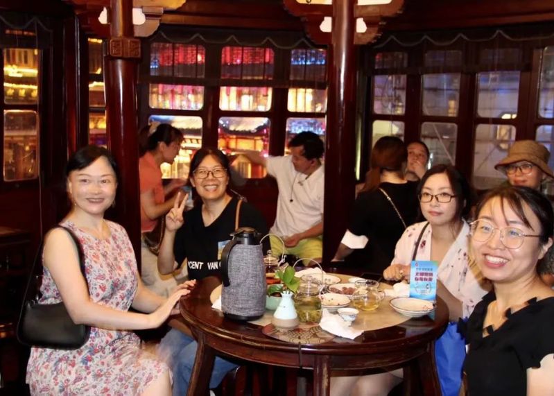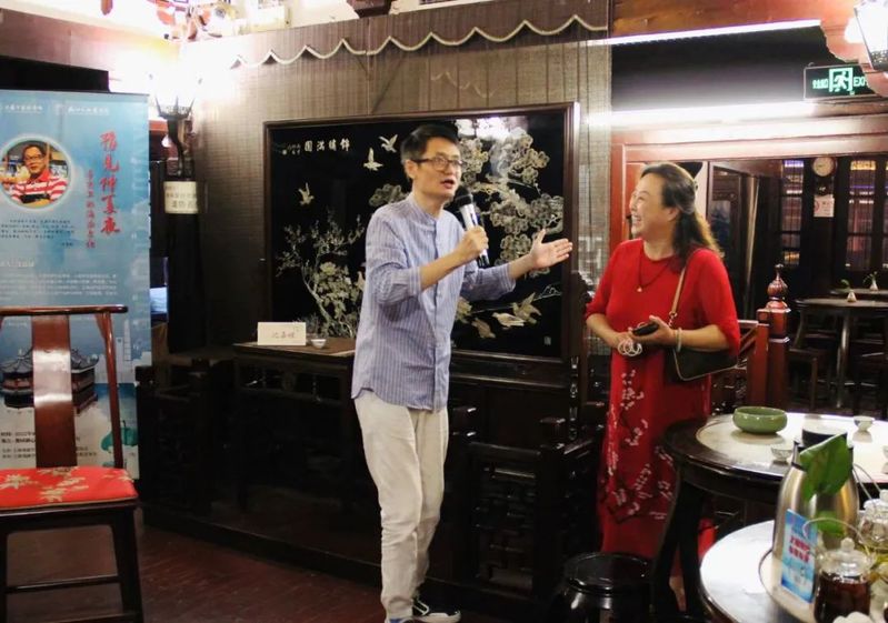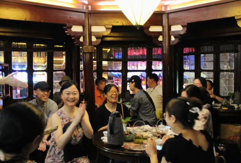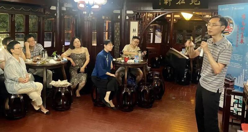 活动间隙,豫园旅游商城市场部的陈先生还简略介绍了湖心亭茶楼的前世今生:始建于清乾隆四十九年(1784年),享有“海上第一茶楼”美誉的湖心亭迄今已有238年的历史。作为上海开埠的标志性建筑之一,她与海派文化的关系千丝万缕,且在上海老城厢文化遗产中具有无可替代的独特地位。这里不仅有悠久的历史和丰厚的积淀,更有高雅的环境与醉人的茶香。参加活动的老师们虽有不少土生土长的上海人,但自己到访过湖心亭并落座品茶的还真是屈指可数。海派文化艺享会2022年首次线下活动能在这个特别的场所如约举行意义不凡,茶楼全体员工的大力支持与周到服务也使我们倍感温馨。