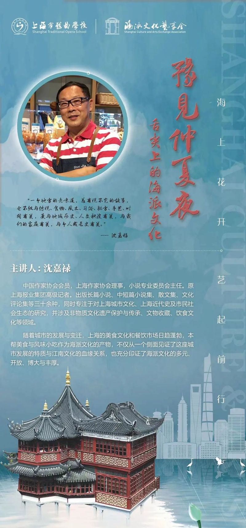 时维七月,序属孟秋,炎暑未退,池荷正灿。在经历了一个特殊的春天之后,上海戏剧学院附属戏曲学校海派文化艺享会利用暑假,相约于久负盛名的豫园湖心亭茶楼。一场名为《豫见仲夏夜——舌尖上的海派文化》之夏日沙龙,在九曲桥畔拉开帷幕。上海戏剧学院工会副主席张云蕾、中职联工会秘书长丁宗勇、上海市工商外国语学校工会主席庞佳波、戏校党总支副书记、副校长刘爱香、戏校工会副主席黄凌霆等校内外领导、嘉宾与广大会员三十馀人欣然莅临。